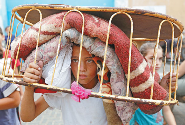 A displaced Palestinian carries his belongings as he leaves a United Nations school in Beit Lahia in the northern Gaza Strip to return to his home on Tuesday, after a 72-hour ceasefire between Israel and Hamas in the Gaza Strip brokered by Egypt came into effect at 8 am. Mohammed Abed / Agence France-Presse |