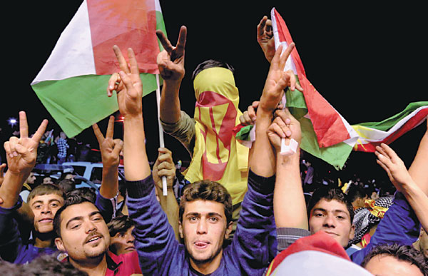 Thousands of supporters of Kurdish Peshmerga forces gather to celebrate as they wait for troops to cross into Turkey en route to Kobani, in the Northern Kurdish region of Iraq, at the Ibrahim Khalil border crossing, on Tuesday. Bram Janssen / Associated Press |