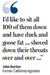He told the San Francisco Chronicle, "I'd like to sit all 100 of them down and have duck and goose fat - better yet, dry oatmeal - shoved down their throats over and over and over again."