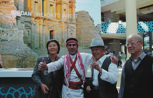 Yinchuan residents take a picture with an employee from Jordan's exhibition booth at the expo. Wang Huazhong / China Daily |