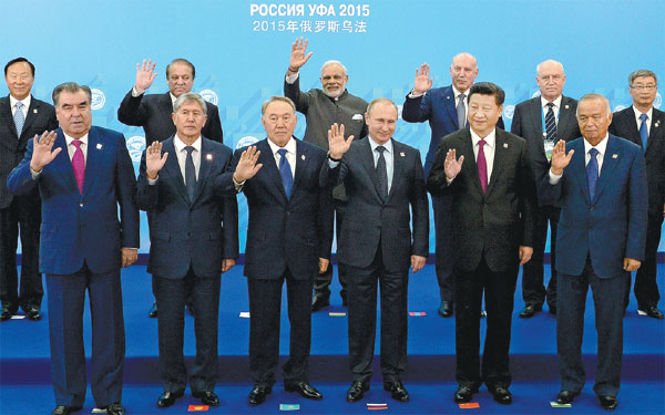President Xi Jinping and other SCO leaders pose for a photo at the summit in Ufa, Russia, on Friday. Associated Press