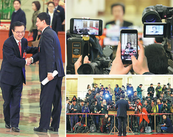 Left: Minister of Commerce Gao Hucheng (left) greets Xiao Yaqing, head of the State-owned Assets Supervision and Administration Commission, in the so-called ministers' passage in the Great Hall of the People in Beijing on Sunday. Above right: The 200-meter-long area is where journalists conduct interviews with leading officials during the annual sessions of the top legislature and political advisory body. Before 2014, the ministers were often pursued or surrounded by journalists seeking their answers to key questions during the two sessions. To avoid such chaos, the new area was set up and ministers were invited to meet the media. Top right: Journalists use video cameras and mobile phones to record an interview with Minister of Justice Wu Aiying on Sunday. Photos by Feng Yongbin and Wang Zhuangfei / China Daily