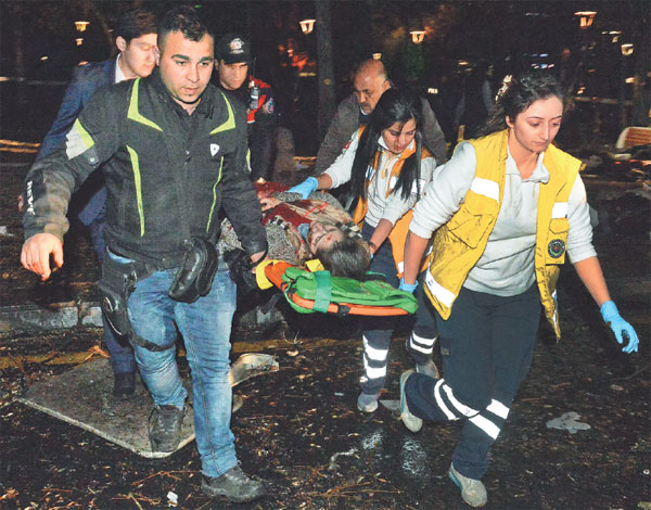 Rescuers carry away an injured person after the explosion in the Turkish capital Ankara on Sunday. Selahattin Sonmez / Hurriyet Daily Via AP
