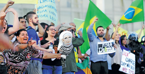 Demonstrators protest against corruption in front of Planalto Palace in Brasilia on Wednesday. Brazilian President Dilma Rousseff has named her predecessor Luiz Inacio Lula da Silva as her chief of staff, sparing him possible arrest for corruption. Ministerial immunity will protect him from prosecution in an ordinary court as Cabinet ministers can only be tried by the Supreme Court in Brazil. Andressa Anholete / AFP
