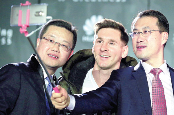He Gang (right), the head of Huawei Technologies' smartphone unit, and Liu Tao, the Chinese company's CEO for Latin American consumer business, take selfies with Argentine soccer star Lionel Messi in Barcelona on Thursday. The company has signed the 28-year-old FC Barcelona striker as its global ambassador. Pau Barrena / Xinhua