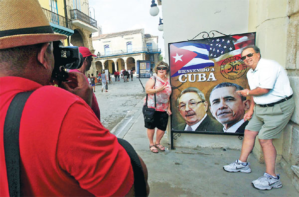 Visitors from California have their pictures taken next to images of Cuban President Raul Castro and US President Barack Obama in Havana on Saturday. The headline on the poster reads, "Welcome to Cuba." Enrique De La Osa / Reuters