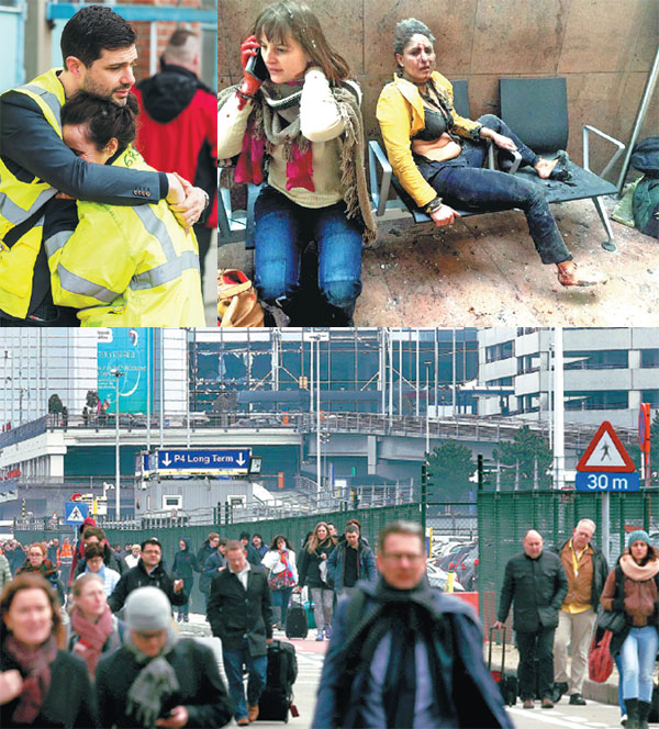 Clockwise fromtop left: Aman comforts a woman outside Brussels Airport after explosions rocked the departure lounge, killing at least 14 people on Tuesday. Two women wounded in explosions at the airport wait for help. People leave the scene of explosions at the airport. Twenty more were killed in a subway train blast during rush hour. Reuters and AP Photos