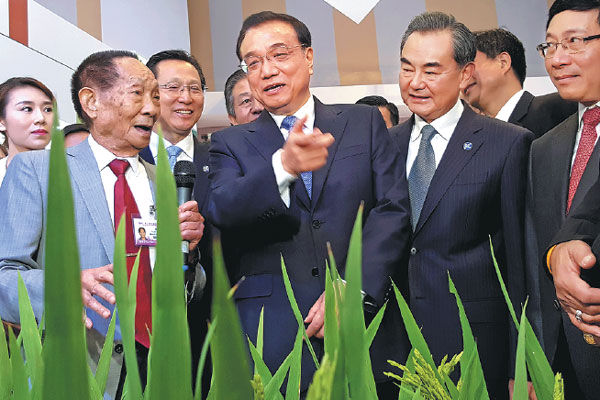 Premier Li Keqiang consults with Yuan Longping (left), known as "the father of hybrid rice", during an exhibition on Lancang-Mekong cooperation in Sanya, Hainan province, on Wednesday. Wu Zhiyi / China Daily