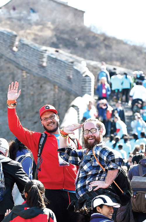 Two US tourists pose as they scale the Great Wall's Jinshanling section in Hebei province on Friday. They are among 1,000 US travelers who hiked the Great Wall on Friday to mark the China-US Tourism Year. Zhao Wei / for China Daily