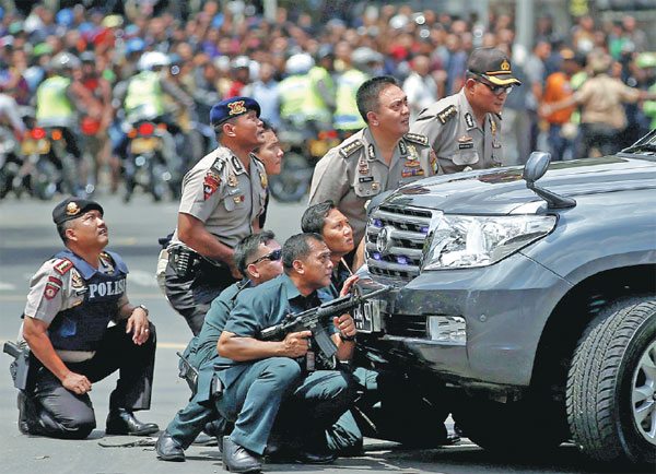 Police officers take cover at the site of a blast in Jakarta, Indonesia, on Thursday. Several explosions struck the center of the Indonesian capital and gunfire broke out. Seven people died. Darren Whiteside / Reuters
