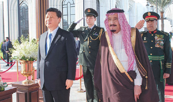 President Xi Jinping is welcomed by Saudi King Salman bin Abdulaziz Al Saud at a ceremony in Riyadh on Tuesday. Xi arrived in Saudi Arabia on the first stop of a three-nation tour of the Middle East. Reuters / Saudi Press Agency