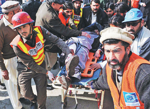 Pakistani rescuers move an injured man after an attack by gunmen on Bacha Khan University in Charsadda, about 50 kilometers from Peshawar, on Wednesday. At least 21 people died in the armed assault. Hasham Ahmed / AFP