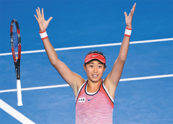 China's Zhang Shuai celebrates on Monday after becoming the first women's qualifier since 1990 to reach the Australian Open quarterfinals. Zhang beat a hobbling Madison Keys of the United States 3-6, 6-3, 6-3. William West / AFP