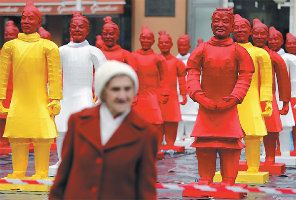 A display featuring replicas of China's Terracotta Warriors is attracting visitors to the main square in Zagreb, the Croatian capital. Eighty of the replicas by sculptor Marin Marinic are on display ahead of Spring Festival and another 80 will join them. See story > p4 Antonio Bronic / Reuters