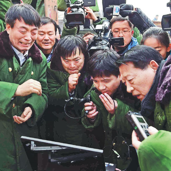 Rescue workers monitor the screen of a life detection system in Pingyi county, Shandong province, on Wednesday, showing that eight miners trapped underground for five days in a gypsum mine collapse are still alive. Plans were being made to bring them to the surface. Guo Xulei / Xinhua
