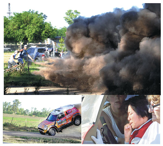 Spectators (top) run for safety after a Mini (above) driven by Guo Meiling of China crashes in the 38th Dakar Rally in Arrecifes, Argentina, on Saturday. Guo (far above) receives medical attention. Reuters