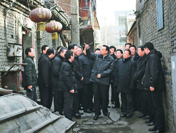 On his first inspection trip of the year, Premier Li Keqiang visits a shantytown in Taiyuan, Shanxi province, on Monday. An emotional Li told some of his accompanying ministers: "Haven't you seen that these people are still living in such conditions?" Liu Zhen/ Chinanews Service