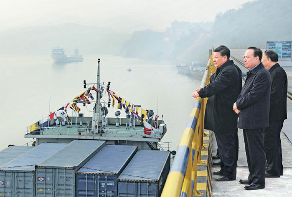 President Xi Jinping inspects Guoyuan Port in the Liangjiang New Area of Southwest China's Chongqing on Monday, his first workday of the new year. Xinhua