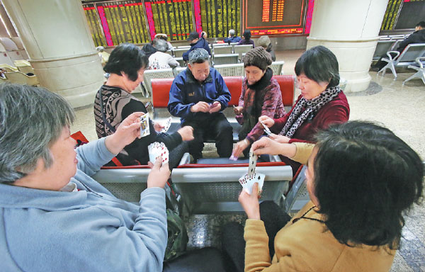 Investors kill time at a trading floor in the Dongzhimen area of Beijing by playing cards on Thursday morning, after trading on the Shanghai and Shenzhen stock exchanges halted. Cao Boyuan / for China Daily