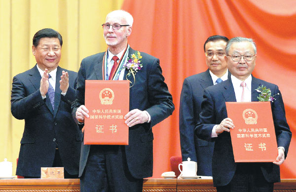 Jan-Christer Janson (front left), professor of technical biochemistry at Uppsala University of Sweden, and Okimura Kazuki, head of the Japan Science and Technology Agency, together with other scientists, receive the 2015 state science and technology awards at a ceremony in the Great Hall of the People in Beijing on Friday. President Xi Jinping and Premier Li Keqiang also attended.Zhou Weihai / For China Daily