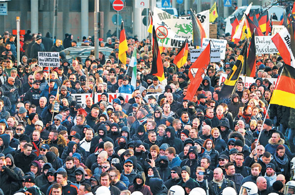 Supporters of the right-wing anti-immigration movement, Patriotic Europeans Against the Islamisation of the West, demonstrate in Cologne, Germany, on Saturday after mass assaults on women on New Year's Eve. Wolfgang Rattay / Reuters