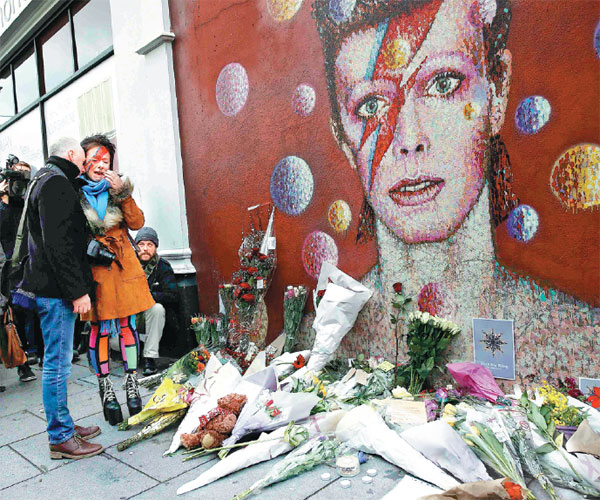A fan of David Bowie is overcome by emotion on Monday as she visits a mural in Brixton, south London, that portrays the British singer/songwriter, who died of cancer on Sunday at age 69. The rock legend's daringly androgynous displays of sexuality, glittering costumes and colorful makeup launched a decadeslong career with such rock hits as Ziggy Stardust and Space Oddity. Stefan Wermuth/ Reuters