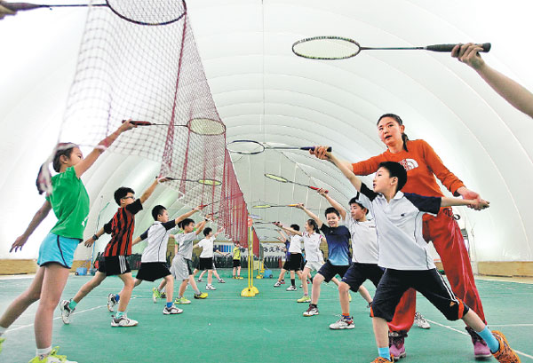 Students at Beijing Haidian Foreign Language Shiyan School attend a physical education class in a plastic dome that shuts out dirty air. Zhang Wei / China Daily