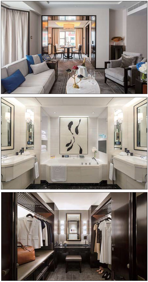 From top: A Beijing suite living room and dining area of The Peninsula Beijing after the renovation; A goldfi sh motif in the bathroom of a deluxe room; The walk-in closet of a deluxe room. |