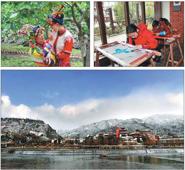 Clockwise from top left: Women taste cherries from Koushan village in Wenchuan county, Sichuan province. Planting cherries has become a pillar industry of the agricultural economy in northern area of Wenchuan. Women in Yingxiu town of Wenchuan embroider traditional designs of the Qiang ethnic group. Shuimo town of Wenchuan is overlooked by snow-capped peaks in winter. Photos Provided to China Daily |