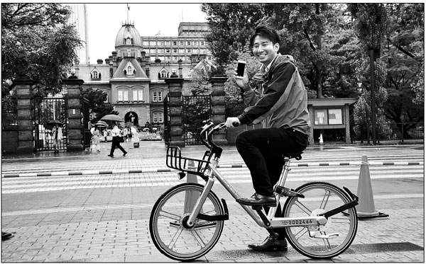A local resident in Sapporo, northern Japan, rides an orange and silver bicycle by Chinese bike-sharing company Mobike. Hua Yi / Xinhua |