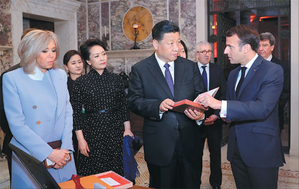 The original French version of An Introduction to The Analects of Confucius, which dates to 1688, is presented to President Xi Jinping as a national gift by his French counterpart, Emmanuel Macron, in Nice, France, on Sunday. The early translations of The Analects of Confucius had inspired French thinkers Montesquieu and Voltaire, Macron said. Ju Peng / Xinhua |