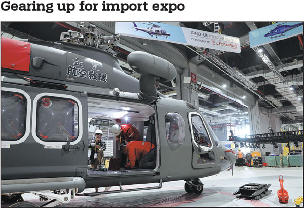 Workers prep a helicopter on Wednesday at the National Exhibition and Convention Center (Shanghai), the venue of the second China International Import Expo. The expo runs from Tuesday to Nov 10. Fang Zhe/xinhua