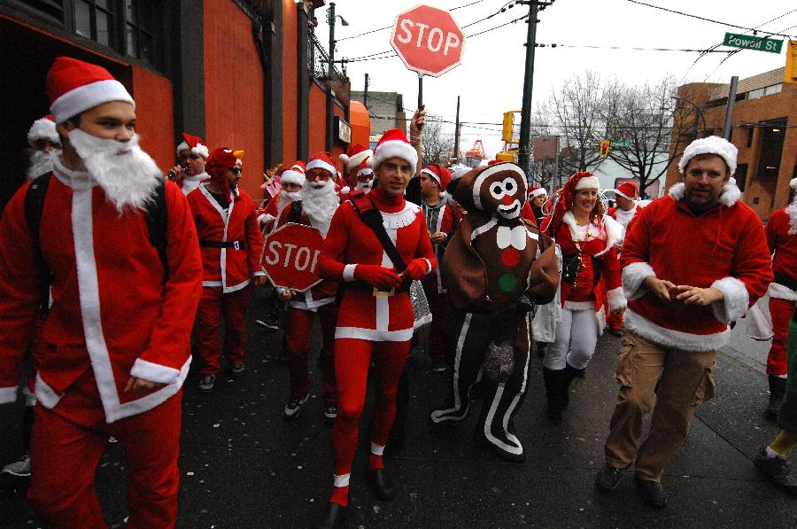 Hundreds of people dressed up in Santa and his helpers' suits take part in the annual SantaCon 2013 in Vancouver, Canada, on Dec 14, 2013. SantaCon is an annual mass gathering of people dressed in Santa Claus costumes parading publicly in cities around the world. [Photo/Xinhua]
