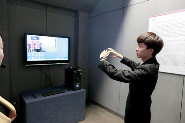 A worker with the institute's animation industry zone displays the interactive technology between human and TV screen.