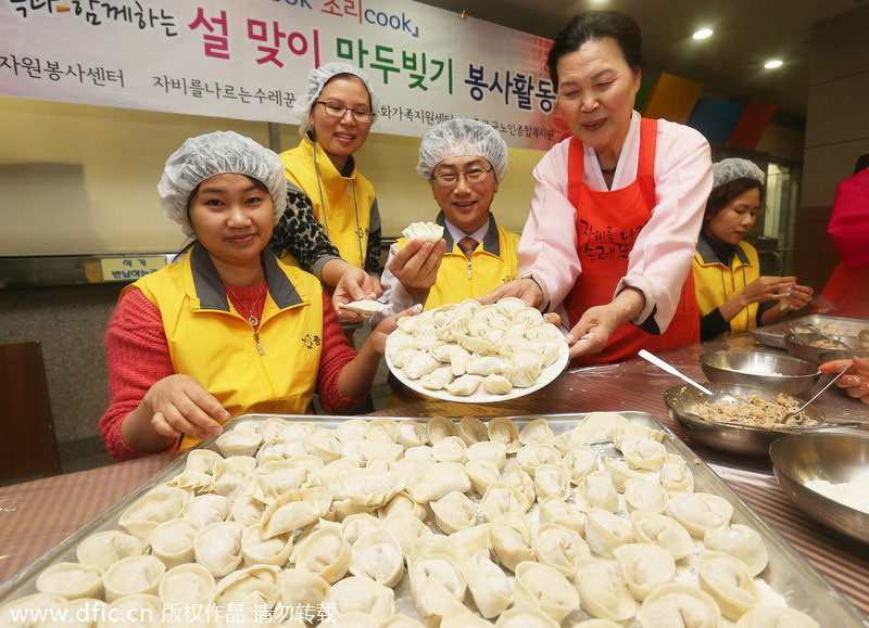 Families of multiple cultural backgrounds display dumplings they have made to celebrate Spring Festival in Seoul, February 5, 2013. [Photo/IC] |