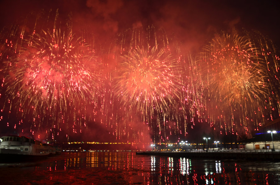 Celebrations for the Chinese Lunar New year hit the big time with a fireworks show over the Hudson River, Feb 17, 2015. The display is the first large-scale fireworks display in the United States to celebrate the Lunar New Year. [Photo by Wang Yu/ chinadaily.com.com]