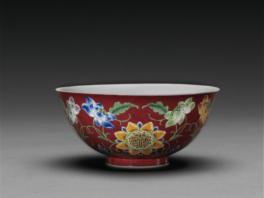 The Rouge-red-ground Bowl with Design of Lotus Flower and Chinese character Shou ("Longevity") showcases the introduction of French craft into China's imperial life.[Photo/Capital Museum]