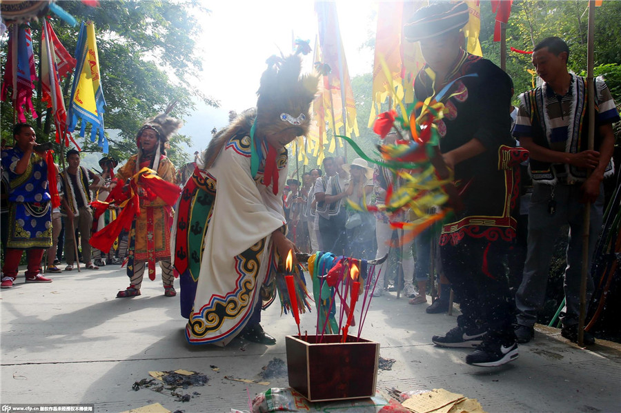 People of Qiang ethnic minority offer sacrifice at the worship ceremony to celebrate the 4,142 birthday of Yu the Great in Beichuan, Southwest China’s Sichuan province, July 21, 2015. [Photo/CFP]