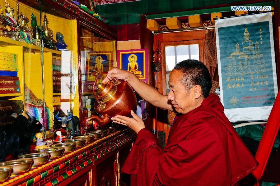 Nyima Tsering pours holy water for worship in his room at Jokhang Temple in Lhasa, capital of Southwest China's Tibet autonomous region, Aug 16, 2015. The 48-year-old monk Nyima Tsering is proficient in Chinese and English. After graduating from the High-level Tibetan Buddhism College in Beijing, Nyima Tsering did the reception work at Jokhang Temple administration committee and introduced temple information to tourists from home and abroad as a tour guide. [Photo/Xinhua]
