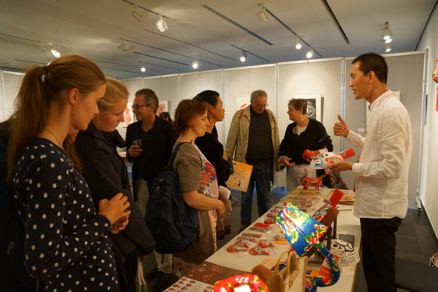 Artist of Shehuo folk face-painting interacts with German visitors. [Photo provided to Chinaculture.org]