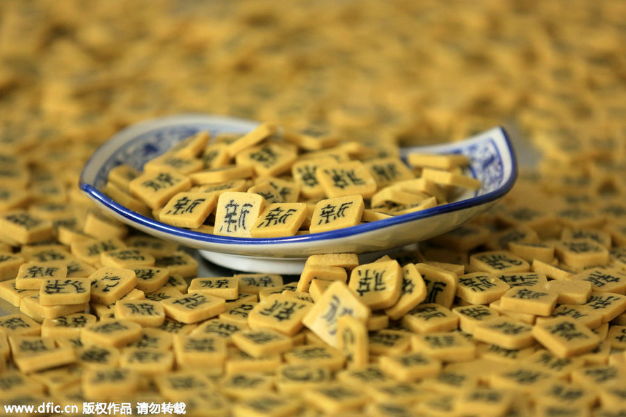 Ancient Huizhou "Character Bean sweets" is a traditional snack in Anhui province. Local people make these sweets with Chinese characters of "New Year" (Xin Nian) to celebrate the New Year. [Photo/IC]