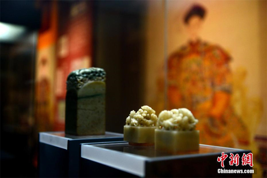 A pair of imperial seals from the reign of Emperor Tongzhi of the Qing Dynasty is on display at the Fujian Museum in Fuzhou, capital of Southeast China's Fujian province, on Sept 29, 2016. The exhibition showcases nearly 100 imperial seals made of Shoushan stone from the Palace Museum in Beijing. Half of the objects have never been displayed to the public. [Photo/Chinanews.com]