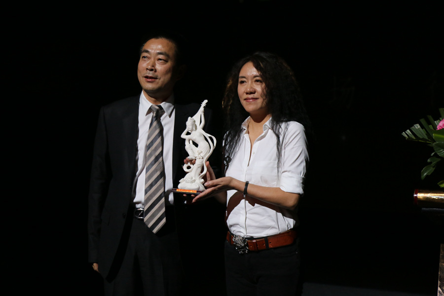 Director Wang Chaoge (right) is named "Honorary Citizen of Dunhuang" at a news conference marking the one-year anniversary of drama, Encore Dunhuang, Sept 18, 2017. [Photo provided to chinadaily.com.cn]