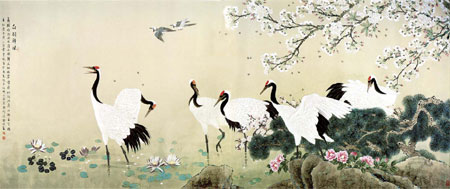 Birds like cranes and peacocks are the most common subject of Yu's paintings. In Chinese culture, the crane is regarded as a heavenly bird that symbolizes longivity. |