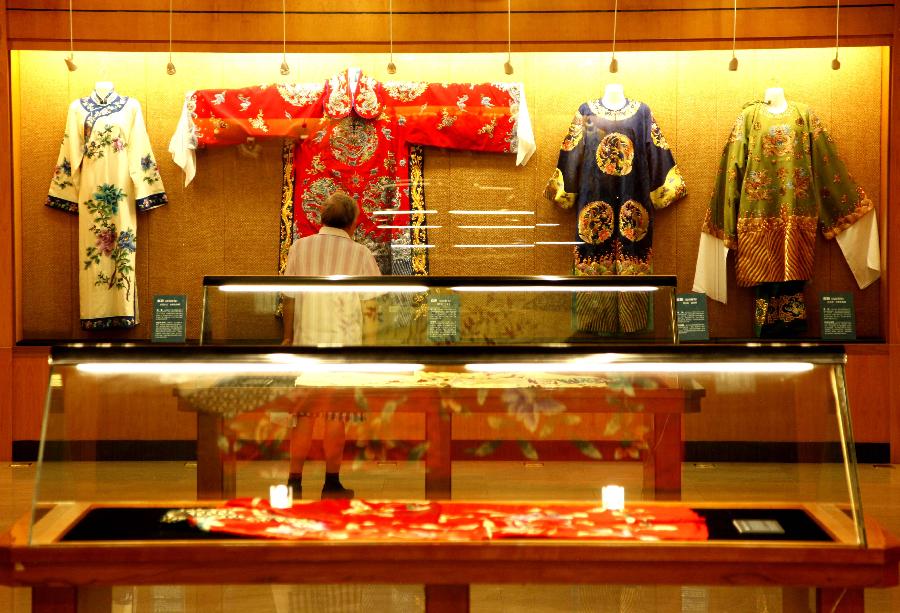 A visitor views costumes worn in opera performance during an exhibition in Shanghai, East China, Sept 4, 2013. [Photo/Xinhua]