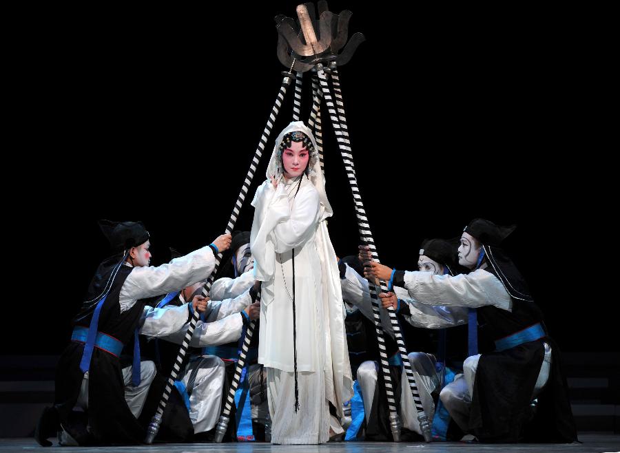Actors perform traditional Kunqu Opera "Peony Pavilion" during the 10th China Art Festival in Jinan, capital of East China's Shandong province, Oct 18, 2013. "Peony Pavilion", created by ancient Chinese playwriter Tang Xianzu (1550-1616), tells a love story between Du Liniang and Liu Mengmei, embodying young people's pursuit of love and freedom. [Photo/Xinhua]