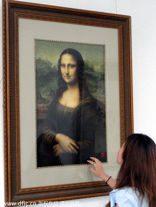 A visitor enjoys a piece of Su embroidery titled “Mona Lisa” at the Su embroidery solo exhibition by Yao Jianping, May 23, 2012.[Photo/IC]