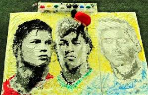 Visitors enjoy a painting at the Xinjiang International Convention and Exhibition Center in Urumqi, the capital city of Xinjiang Uygur autonomous region, June 24, 2014. [Photo by Li Xiongxin/Asianewsphoto]