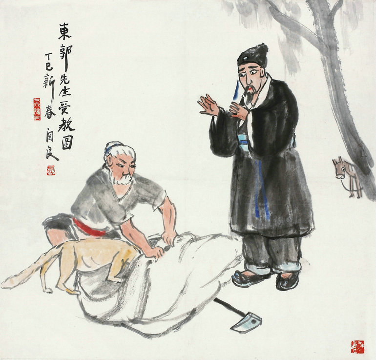 The story is about a traveling scholar, Mr. Dongguo, saving a wounded wolf. But the starving wolf pounced on Mr. Dongguo and intended to eat him. When Mr. Dongguo protested at the wolf's ingratitude, the wolf presented the argument: If the wolf has nothing to eat it will die. Since the scholar saved its life once why not do it again? Finally, Mr. Dongguo is saved by a famer passing by. The painting depicts the scene where the famer kills the wolf and tells Mr. Dongguo to not trust beasts any more.