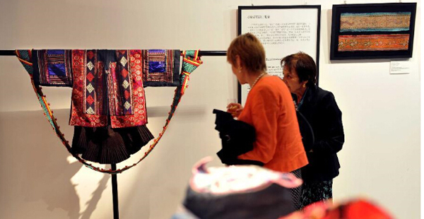 Visitors look at embroidery works during the 2014 China Miao Embroidery Exhibition for Public Benefit at Xinhua Photo Gallery in downtown Paris on Sept 30, 2014. [Photo/Xinhua]